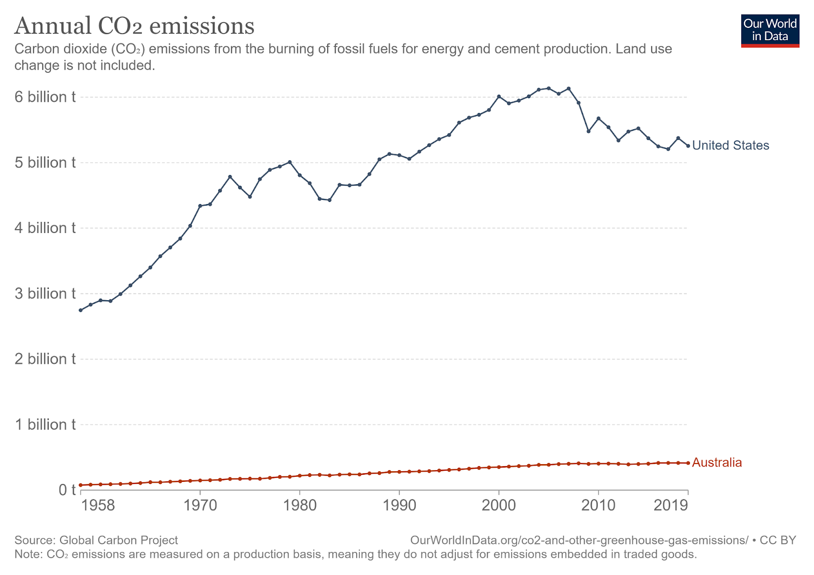 Figure 1: Annual CO2 emissions between 1958 and 2019 in the United States and Australia