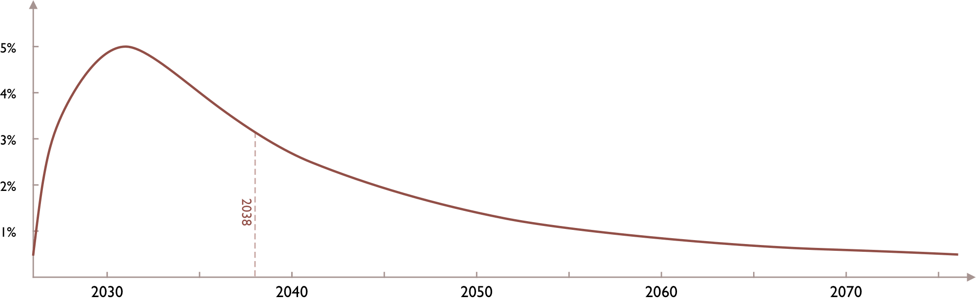 Here’s an illustrative distribution for AGI timelines used by Ben Todd of 80,000 Hours: