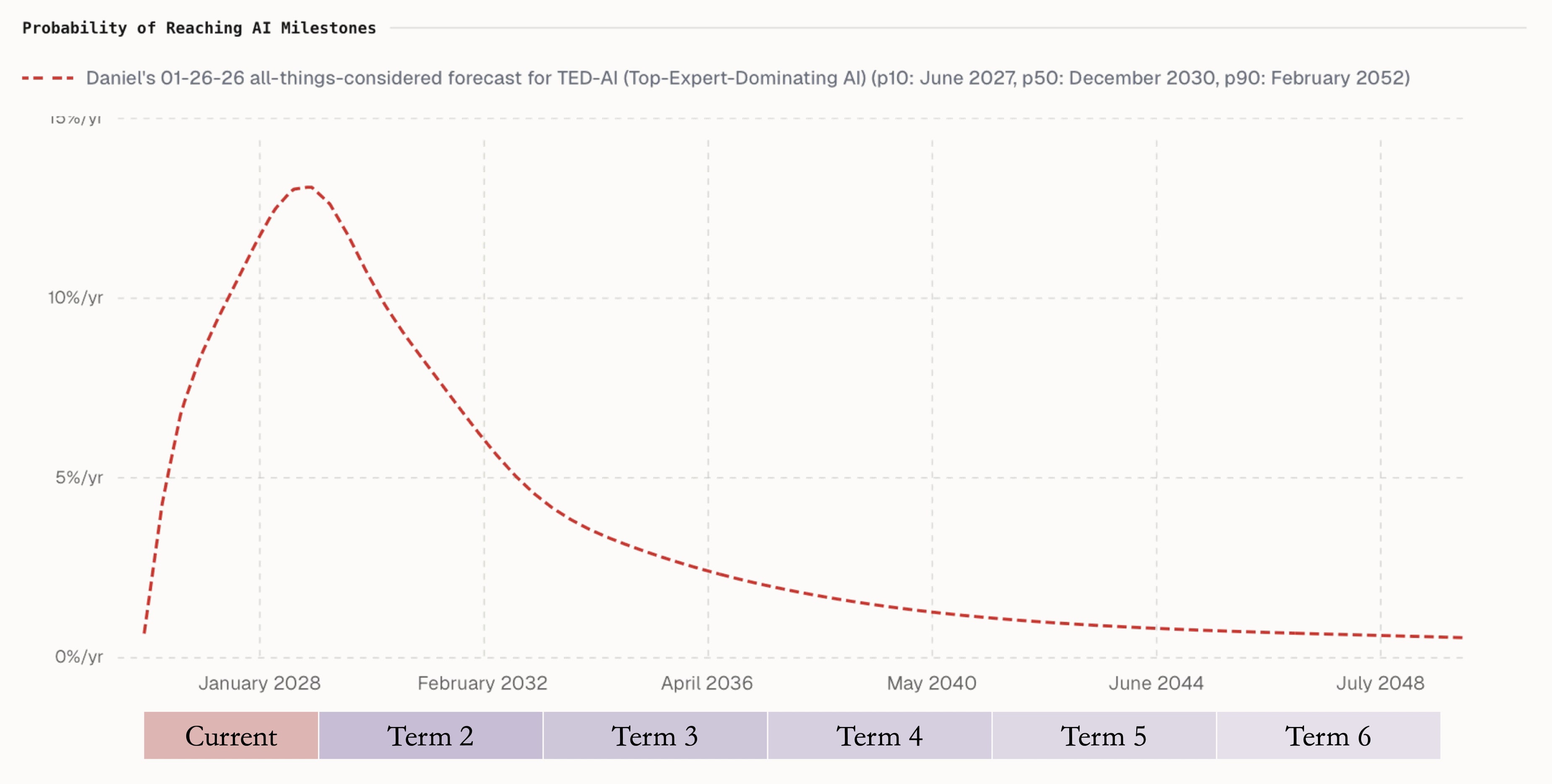 For example Kokotajlo’s distribution implies a 28% chance transformative AI will happen during the current presidential term, a 35% chance it will happen in the next term, a 13% chance it will be the one after that, with 24% left over spread among ever more distant terms: