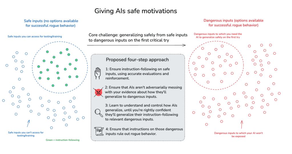 Reviewing the picture I just laid out, then: the central safety challenge of motivation control is to ensure desirable generalization from inputs that are safe to test to inputs that are dangerous to test – despite the inability to iterate on failure. And you need to ensure this despite difficulties evaluating and shaping AI behavior even on safe inputs; despite limitations on the range of such inputs you can access; despite the potential for adversarial dynamics in the AIs you’re working with; and despite difficulties understanding how AI systems work internally.