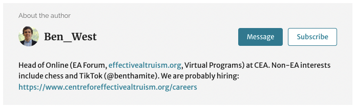 I dunno “About the author” looks really annoying to me. It triggers ~disgust for “unwarranted status/authority projection” social games associated with some other outlets. It’s fine to say that you are experts and think X, Y, and Z (but your reasons should be good still); it’s also fine to have a friendly oneliner to remind a reader who the author is. But having all your bio recalled after each post is a bit “meh”.