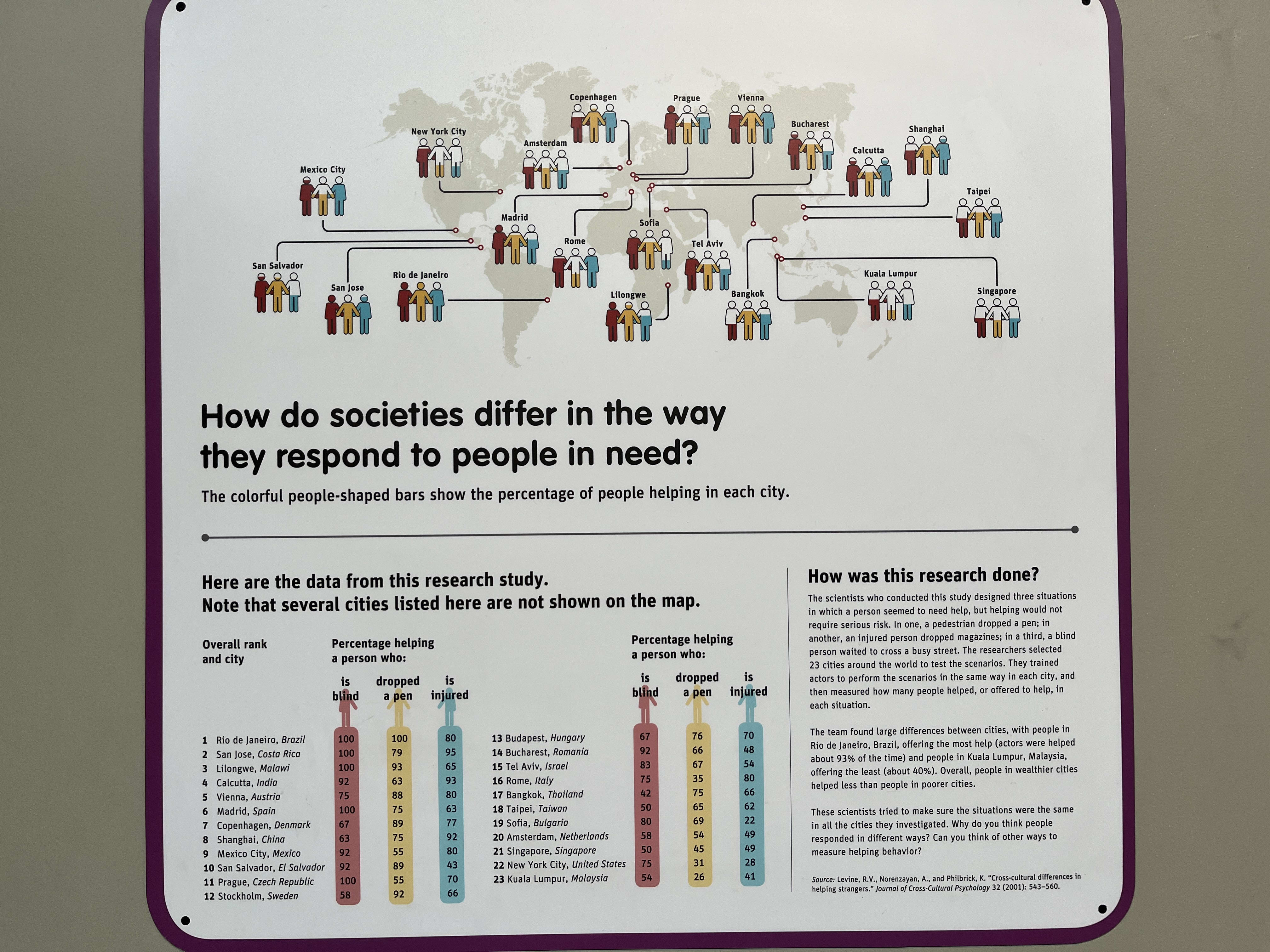 I’m also reminded of a display from the Exploratorium, showing how willing people in different countries are to help strangers. This isn’t an area I’ve read much about, but I suspect that the cultures we grow up with affect behavior more than more people acknowledge.