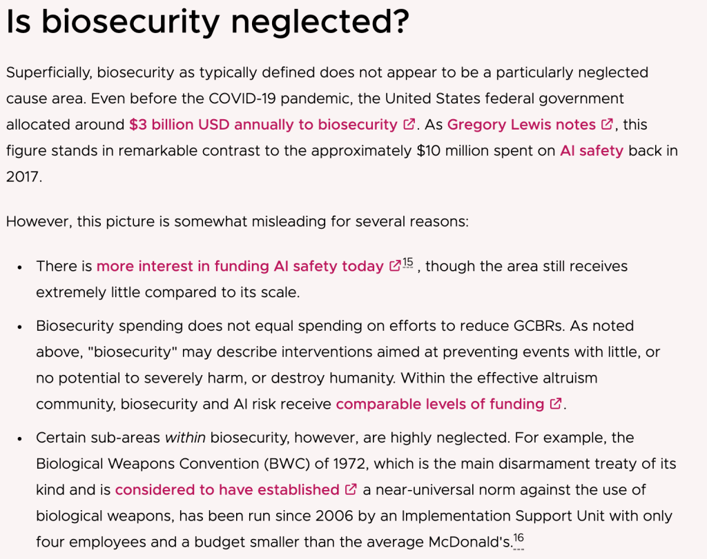 In a similar vein, when Giving What We Can argues that biosecurity is neglected, despite its relatively high level of current funding, they point to the underfunding of the Biological Weapons Convention: