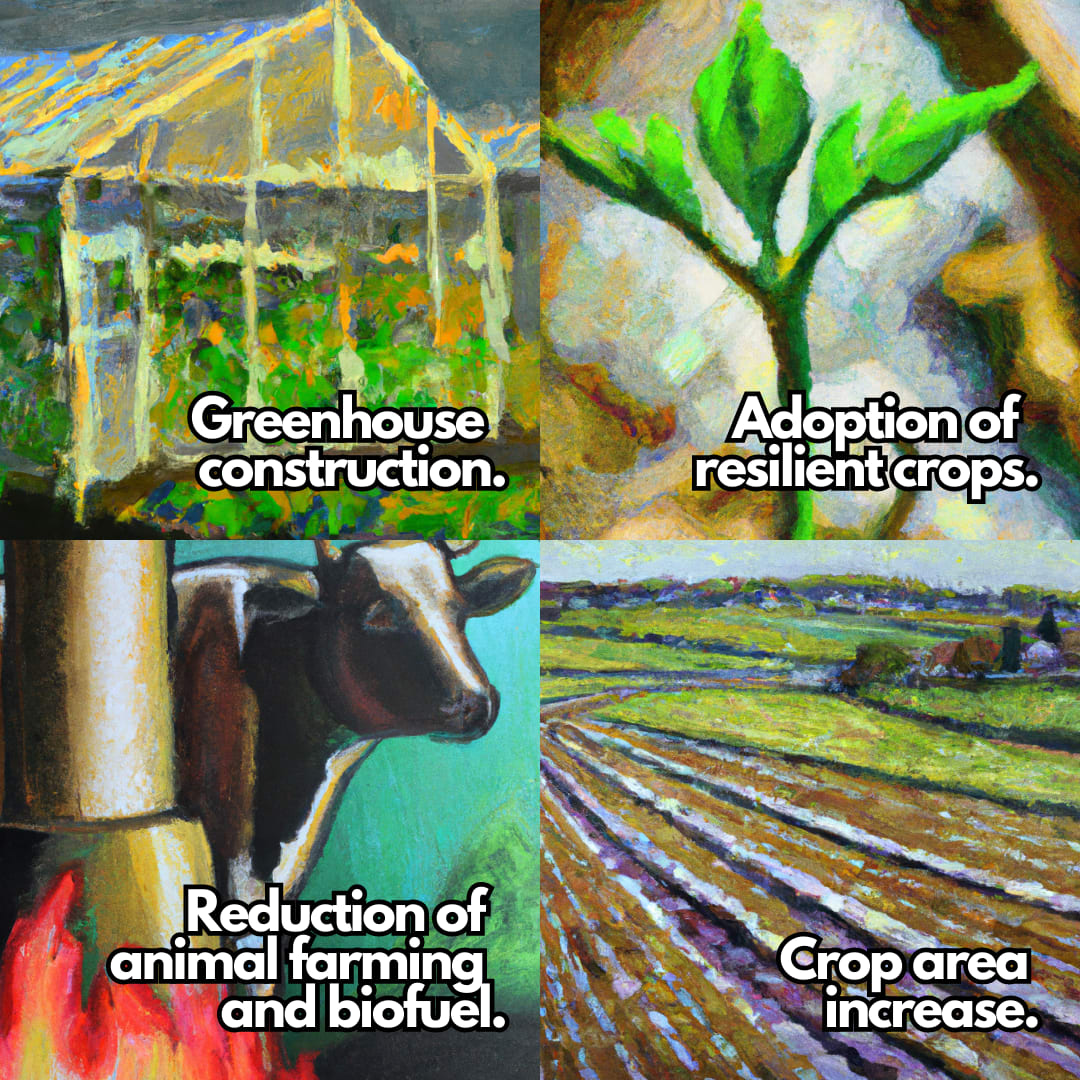 Adaptation of agricultural systems to increase food production, including the deployment of solutions such as crops relocation tolerant to low temperatures and precipitation conditions, rapid construction of greenhouses taking into account the Argentine bioclimatic regions, and the expansion of cultivation areas through the adaptation of arable land currently not used for food production.