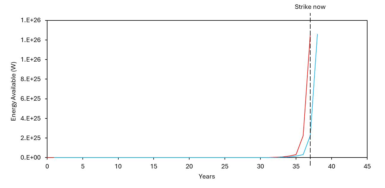 This results in a huge power imbalance near the end of construction, where the first mover has ~5x as much energy after ~36 years. The first mover could leverage this advantage to destroy the second mover. It’s unclear exactly how, but if you have that much energy, you’d have a lot of options, including lasers and kinetic missiles.
