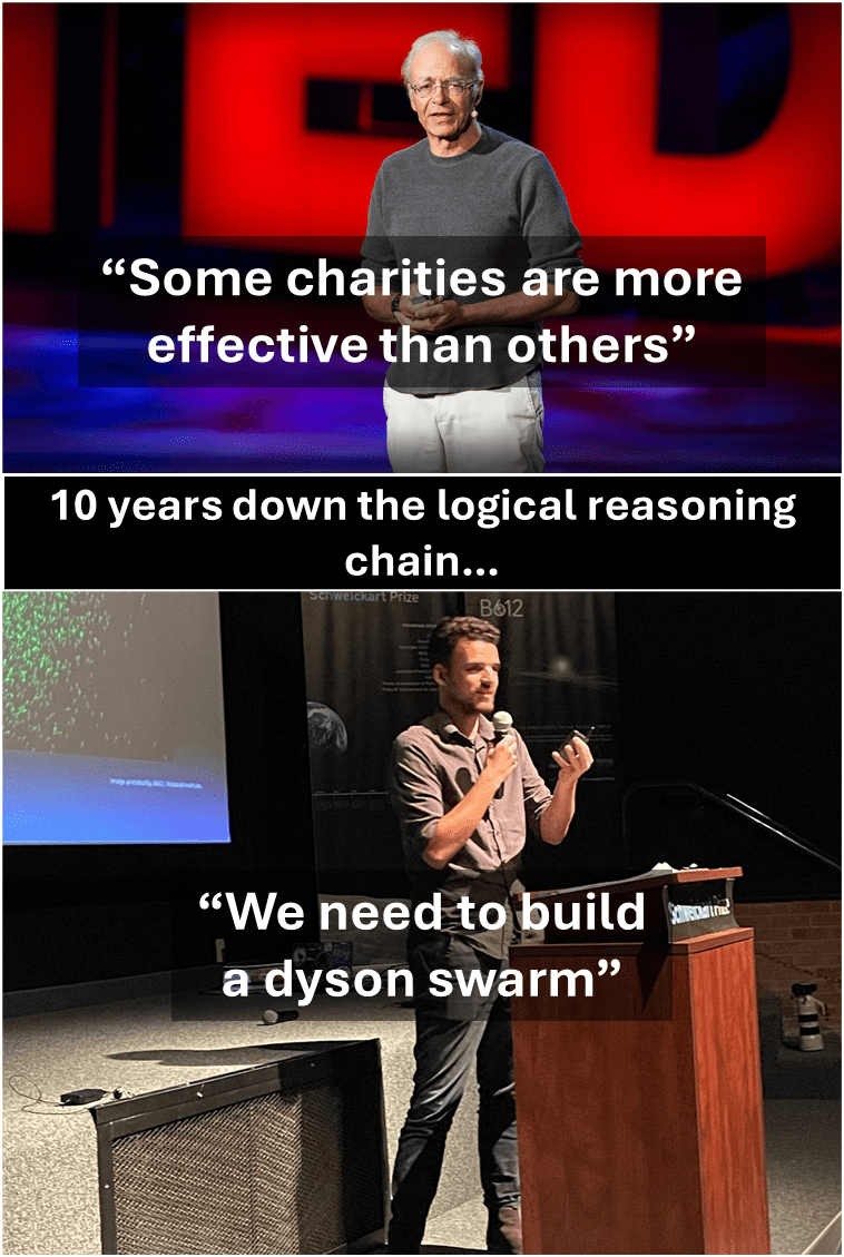 If competition for Dyson swarm construction is a game of chess, the pieces are already moving: Google is working on Project Suncatcher, Sam Altman is chatting about Dyson swarms, Elon owns a space company, an AI company, and a solar panel company, and is discussing building thousands of solar-powered AI satellites. Building a Dyson swarm is currently legal. Dyson swarms are extremely important for the long-term future and they can’t really be ignored by the longtermism and large scale space ethics communities anymore. One actor cannot be allowed to decide what to do with the long-term trajectory of human civilisation—that’s a decision for all of humanity, or, at least, everyone who cares about that sort of thing.