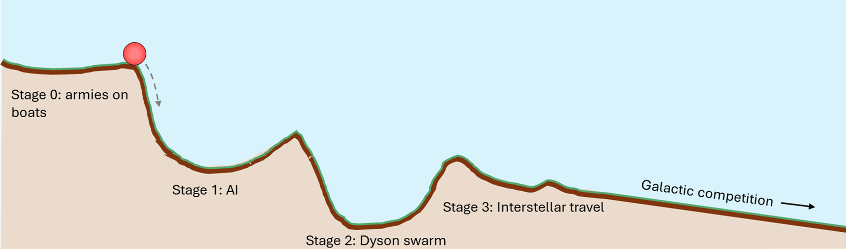 Thanks Tom, yeah the threat model for stage two is quite similar to your post, where I’m expecting one actor to potentially outgrow the rest of the world by grabbing space resources. However, I do think there might be dynamics in space that feed into a first mover advantage, like Fin’s recent post about shutting off space access to other actors, or some way to get to resources first and defend them (not sure about this yet), or just initiating an industrial explosion in space before anyone else (which maybe pays off in the long-term because Earth eventually reaches a limit or slows down in growth compared to Dyson swarm construction).