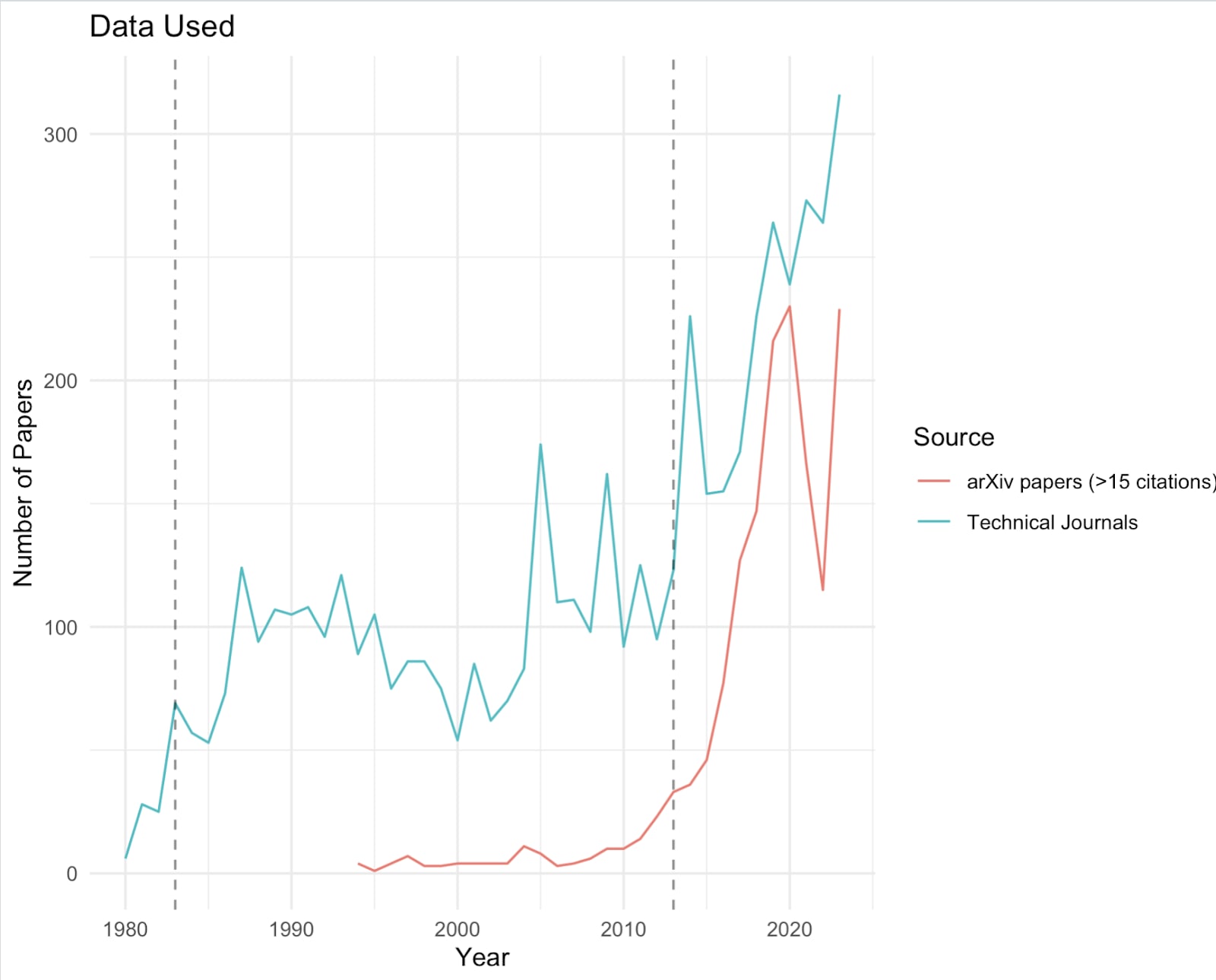 The number of journal publications before 1980 and ArXiv papers before 2012 was small (less than 30 papers found annually), so I excluded these years for each respective category.