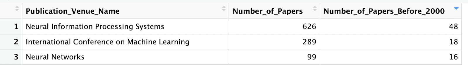 Some long-standing journals had a specially low number of old publications: e.g. NIPs, founded in 1987, only had 48 publications. So, many papers were either (1) missing from the original dataset or; (2) excluded by the classifier. Annoyingly, the Semantic Scholar API doesn’t allow you to search for specific journals. However, I don’t think either (1) or (2) should lead to a biased sample of publications from these AI journals.