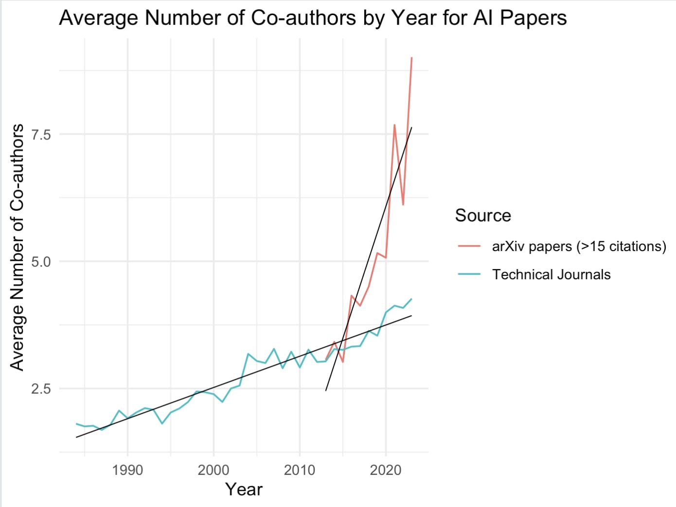 Another explanation might be that academic standards within academic journals or on ArXiv are becoming more rigorous, leading academics to cite papers more. Alternatively, AI academics might be becoming more sociable – i.e. citing their friends’ papers more, and collaborating more on papers. I don’t find either of the explanations particularly convincing.