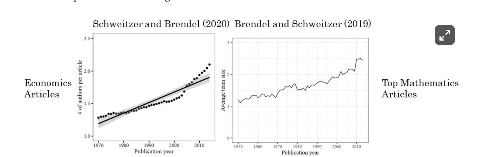 Brendel and Schweitzer (2019, 2020) found that average team size were increasing for top mathematics and economics articles respectively.
