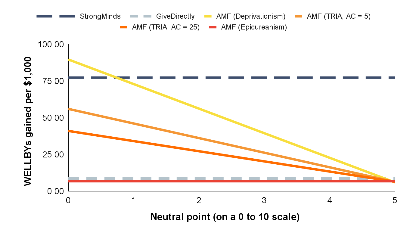 As we can see, AMF is more cost-effective than StrongMinds, but only by a small amount, and only on the assumptions most favourable to saving lives: if you accept deprivationism (the yellow line) and think the neutral point is less than 1. On assumptions of higher neutral points and/or different accounts of the badness of death, AMF’s cost-effectiveness drops away until it becomes about 12x less cost-effective than StrongMinds and has about the same cost-effectiveness as GiveDirectly. AMF never ends up much less cost-effective than GiveDirectly on our estimates due to the non-trivial life-improving effects of bednets from averting grief and increasing later income.