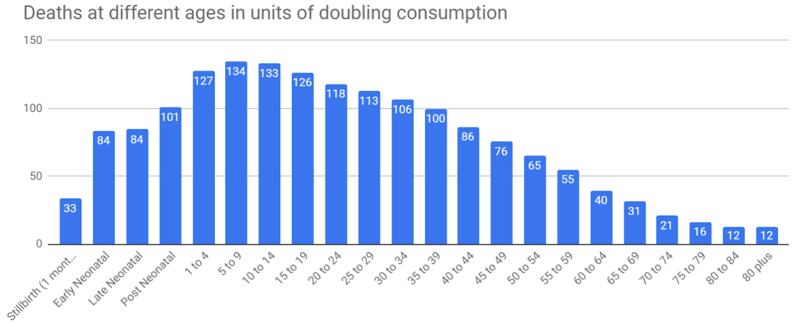 Figure 1: GiveWell’s disvalue of death at different ages in units of doubling consumption