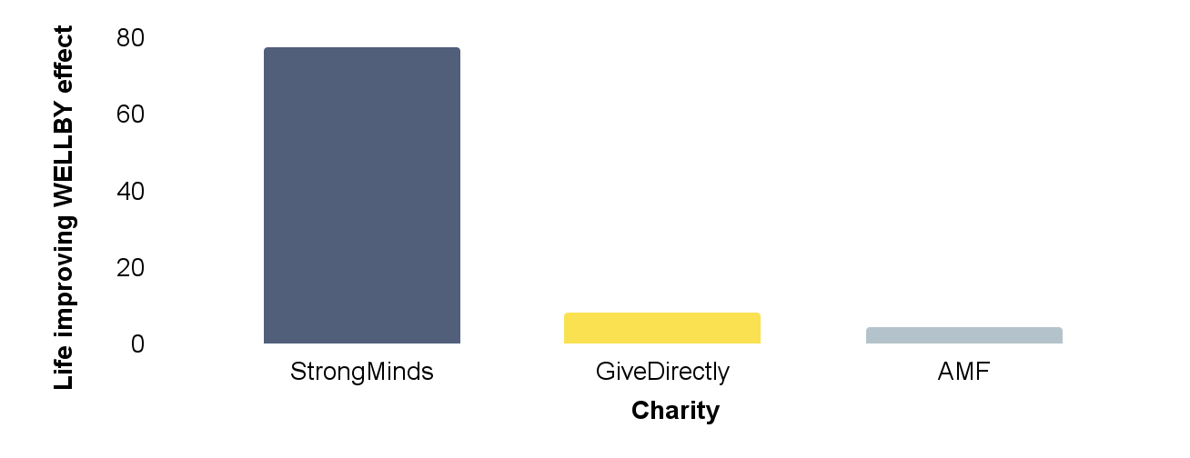 We assess the cost-effectiveness of each charity using a subjective wellbeing (WELLBY) framework. We’ve argued that effectiveness should be assessed in WELLBYs in general (McGuire et al., 2022a). In this case, it’s unclear how else we could capture the benefits of cash transfers, bednets, and psychotherapy in any other common unit. What would we use? Wealth? Health? Effects on wealth might be a good way to assess the impact of cash transfers, but not those of being alive or depression-free. Equally, effects on health might capture the value of bednets and therapy, but presumably, the value of alleviating poverty isn’t just that it improves health.