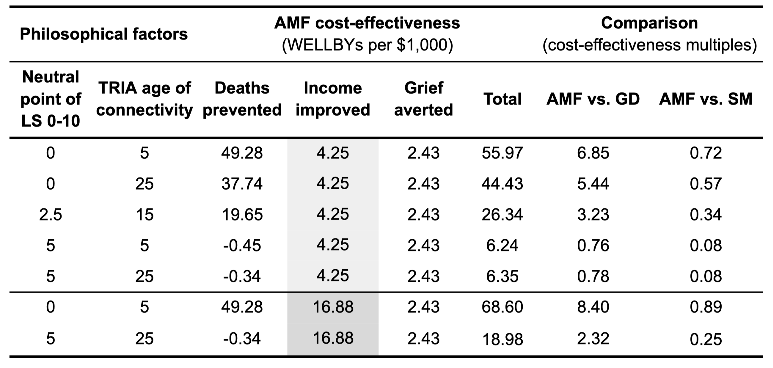 We can now calculate the cost-effectiveness of AMF under different assumptions about the location of the neutral point. If the neutral point is zero, the value of preventing a death would become 4.95 * 50 = 247 WELLBYs; this gives a cost-effectiveness of 83 WELLBYs/$1,000. This, combined with the life-improving and grief-averting benefit of 7 WELLBYs leads to a total of 90 WELLBYs,/$1,000 which is represented in the first row of Table 1 below.