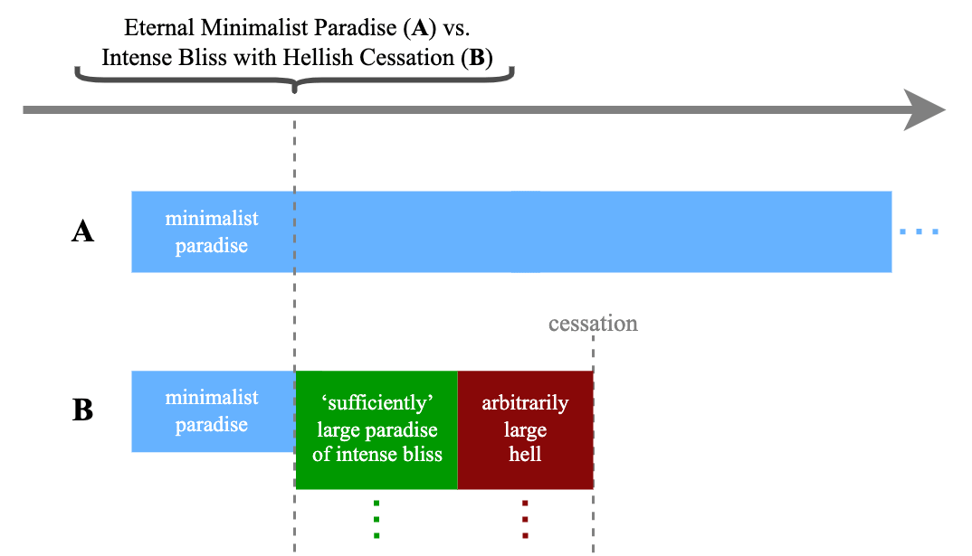 ‘Intense Bliss with Hellish Cessation’ (Figure 5.2). Assume a “minimalist paradise” that contains sentient beings experiencing complete peace and contentment, but not (purported) positive pleasure.[31] All else equal, offsetting views imply that it is better to reject the eternal continuation of this paradise and to instead choose a sufficiently large paradise of intense bliss that ends in an arbitrarily large and hellish cessation.[32]