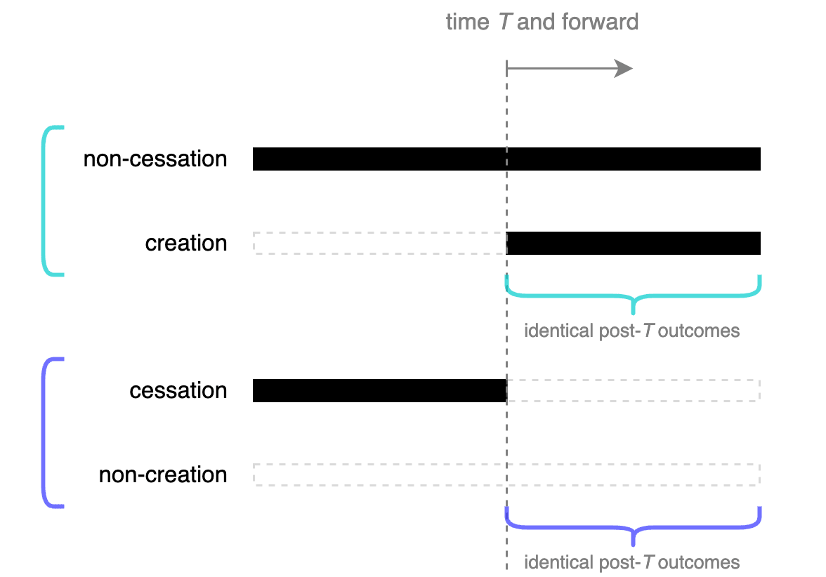 From an experientialist consequentialist perspective, the outcome of the non-cessation choice is that a world does exist in place of an empty world, which is outcome-equivalent to the creation of a similar world — from the moment of the choice onward — in place of an empty world.