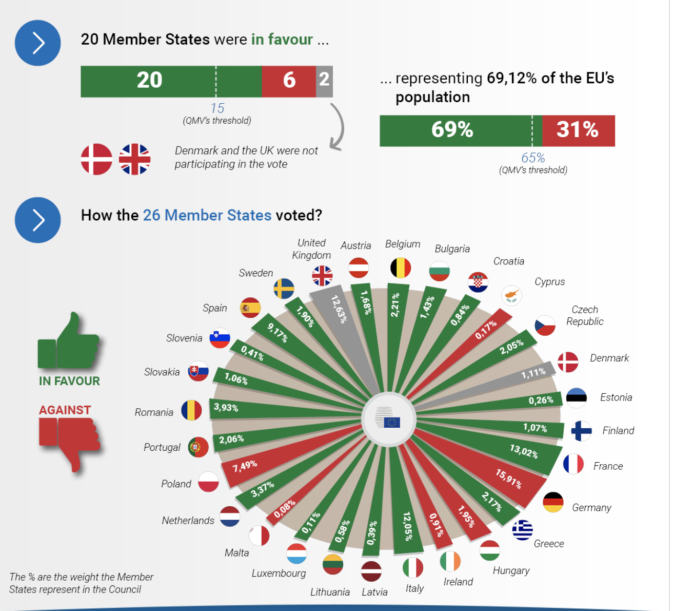 A major reason for the watering down of Commission proposals appears to be that to adopt a proposal into EU law requires a special voting majority to be reached (“qualified majority voting” or QMV).[11] Today, this requires the support of at least 55% (15/27) of countries representing 65% of the EU population,[12] but to block a proposal only requires 4 countries representing 35% (see an example from VoteWatch.eu in the image below).[13] Council negotiations involve the formation and dissolution of blocking minorities through concessions and vote exchanges until a blocking minority-proof majority is formed. In practice, actual “voting” is rare and proposals are adopted when the Presidency and the Council representatives have concluded backroom negotiations with sufficient confidence that not enough countries will object.