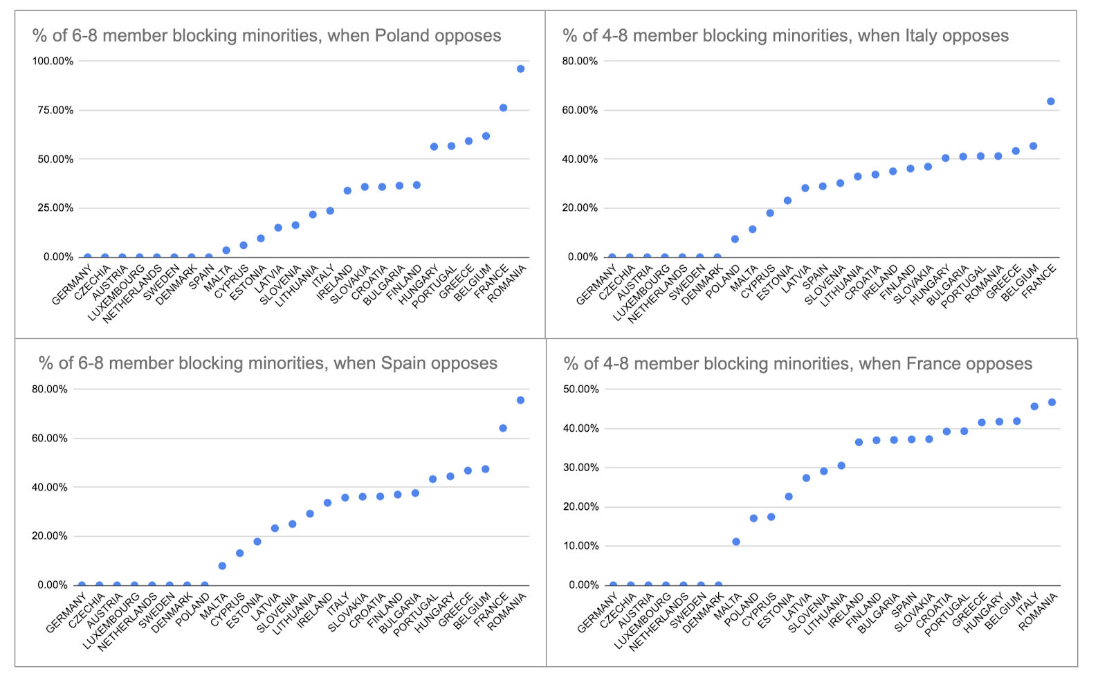 Disrupting blocking minorities: Avoid the most likely anti-reform coalitions by targeting the lowest hanging fruit among countries that are most often parts of minimally viable blocking minorities or in “swing vote” positions: Germany, France, Spain, Italy, Poland, Czechia, Slovakia, Belgium, Romania, Portugal, Latvia, Lithuania, Estonia, and/or Greece.