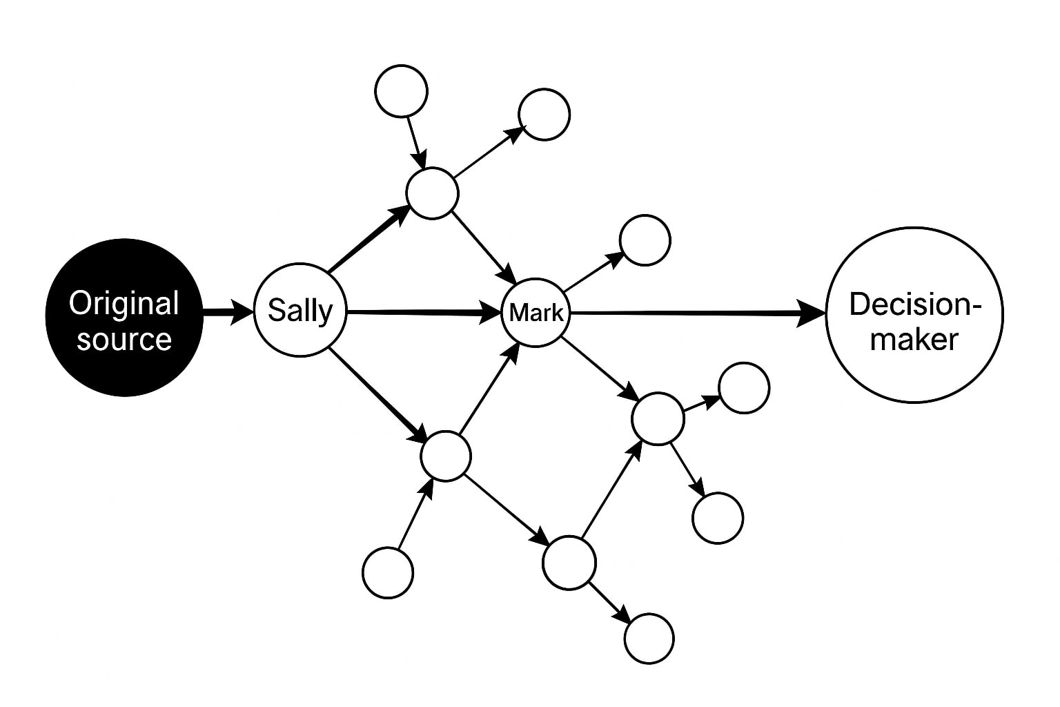 This binary thinking misrepresents how information actually propagates through systems. In reality, valuable insights rarely travel directly to ultimate decision-makers. The Hollywood model (i.e. the highly simplified model) of direct access to power oversimplifies real-world influence dynamics.