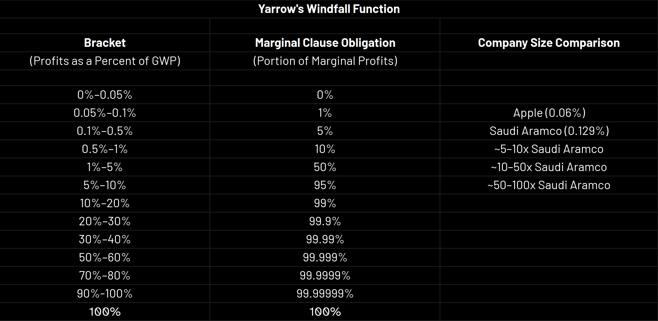Incentive Alignment — Companies who take the pledge should always have an incentive to make more profits. There should be nothing in the windfall function that might deter companies from increasing profits to avoid reaching the donation threshold. People interested in this property could research what type of metrics work best for determining the thresholds for donation while still encouraging growth (i.e. profits vs market cap).