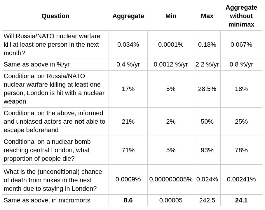 The overall question we focused on was: What is the risk of death in the next month[7] due to a nuclear explosion in London?. We operationalized this as: “If a nuke does not hit London in the next month, this resolves as 0. If a nuke does hit London in the next month, this resolves as the percentage of people in London who died from the nuke, subjectively down-weighted by the percentage of reasonable people that evacuated due to warning signs of escalation.” We roughly borrowed the question operationalization and decomposition from Jacob Hilton.