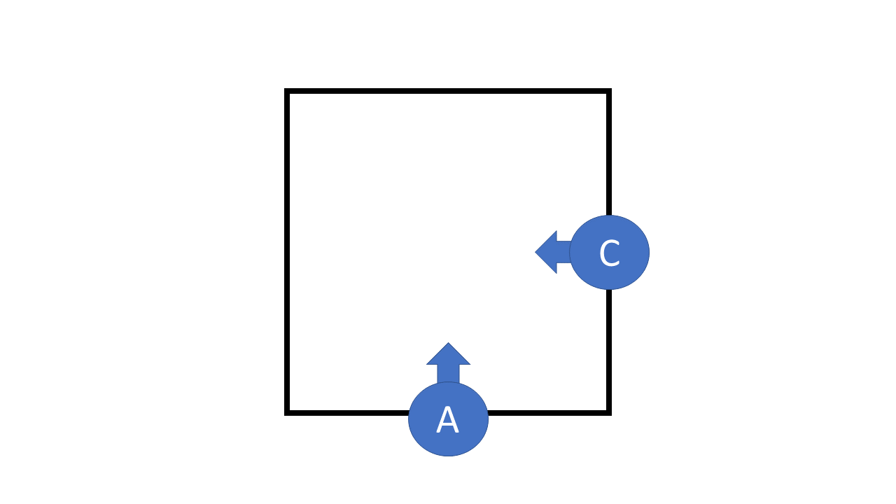 Let us take a look at the example of Anna (A) and Christoph (C) that can be seen in figure 1. Each of them is traveling at half the speed of light into the center of a square, coming from 2 adjacent sides of the square. From our perspective (in the rest inertial system of the square), both depart from their origin at the same time and arrive at their destination (the other edge of the square) at the same time. However, statements about which events take place at the same time, are not absolute and vary from inertial system to inertial system. From the perspective of Christoph, he himself does not travel with half the speed of light to the left but is at rest, and the square moves with half the speed of light to the right. Also, Anna’s trajectory is different for Christoph than for us. For him, she departs from her origin, before Christoph departs from his wall, and she arrives at her destination after Christoph reaches his destination. (Or in Christoph’s terms: before his destination reaches him.)