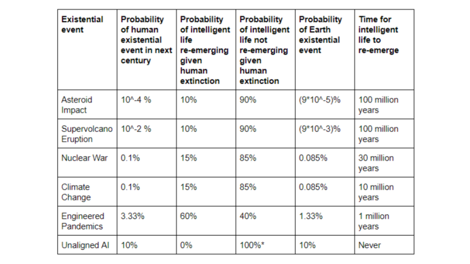 Therefore it should not affect how we compare different x-risks. For example, if we assumed re-evolved life had a 10% chance of being morally aligned with humanity, this would apply in all existential scenarios and so not affect how we compare them. The question of what being “morally aligned” with humanity means, and whether this is what we want is also a big question I appreciate. I avoided discussing the moral philosophy as I’m uncertain how to consider it, but I agree it is a crucial question.