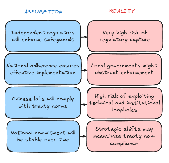 Even sincere enforcement by aligned national regulators might be meaningless if the labs are able to find ways around the regulations; and this process could follow different rules in China that the treaty does not anticipate.