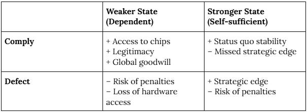 As China becomes more self-sufficient in hardware and foundational models (see MERICS, 2025), the incentive to “defect” from the treaty increases. China today struggles to produce its own cutting-edge hardware at scale, and is therefore more likely to comply if it wants to preserve access to international markets and maintain its reputation. On the other hand, a more self-sufficient actor (such as the US today, or China in the near future) sees little cost to defection, especially if enforcement is weak or slow. This basic dilemma can be illustrated with a simple payoff grid: