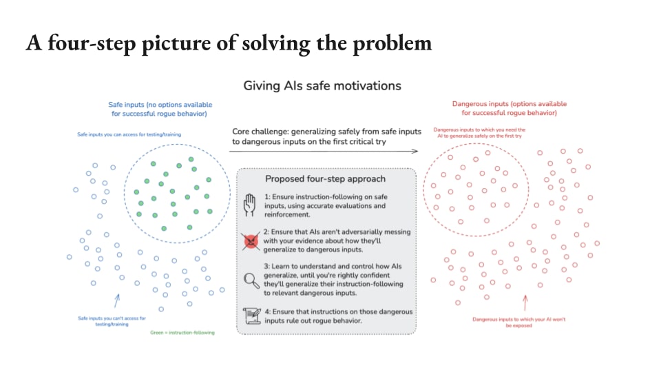 A proposed four-step solution: (1) ensure robust instruction-following on safe inputs, (2) prevent alignment faking, (3) secure non-adversarial generalization to dangerous inputs, and (4) design instructions that clearly rule out rogue behavior.
