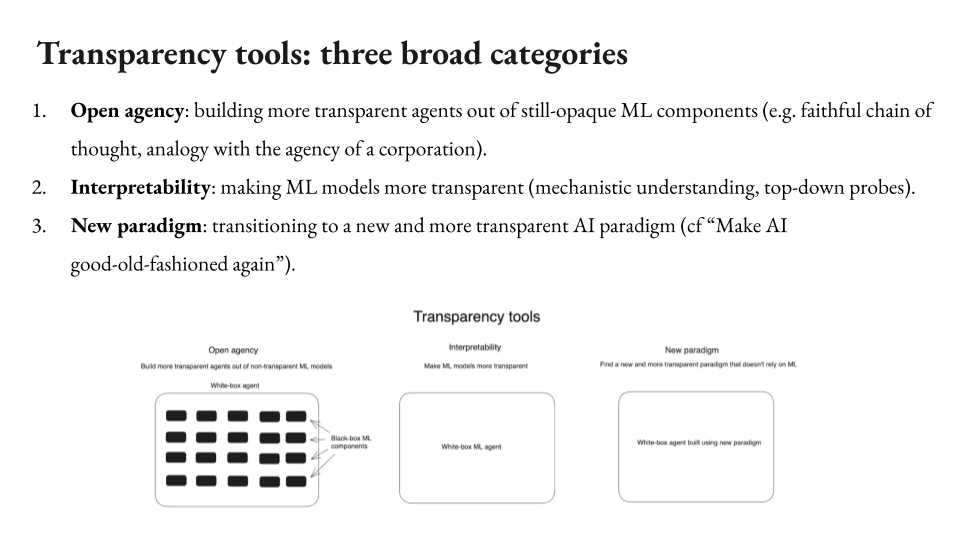 One I’m calling open agency, which is basically building more transparent agents out of still-opaque ML systems. So it’s sort of leaving the opacity of ML systems as a constraint, but nevertheless, trying to build agents using these opaque black boxes out of them such that it’s still nevertheless transparent at some higher level of abstraction to a degree necessary for safety.