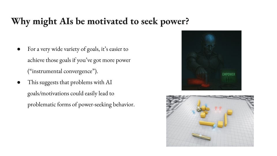 So the thought is if there’s, in some sense, a wide basin of AI systems that would do this sort of thing, if you get their motivations wrong, so uh-oh, if you’re not really good at engineering those motivations and they’re in this position, maybe you end up with these AI systems seeking power in pursuit of these problematic motivations. So that’s the very broad vibe for why you might get into this concern at all.