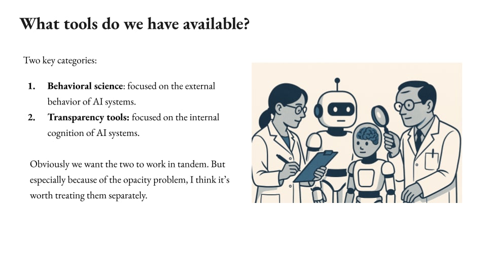 Tools include intensive behavioral science (systematic testing across many environments) and transparency methods (interpretability, faithful reasoning traces, or new paradigms).