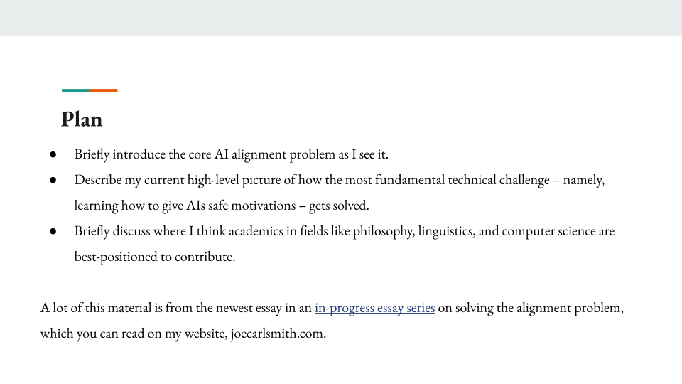 I’m going to briefly introduce the core AI alignment problem as I see it. It’s going to be a particular version of that problem, the version that I think is highest stakes. And then I’m going to talk about my current high-level picture of how that problem gets solved at a technical level. There’s a bunch of aspects of this problem that aren’t the technical level that are also crucially important, but I’m going to focus on the technical dimension here. And in particular, the dimension focused on the motivations of the AI systems that we’re building. That also is not the only technical dimension. There’s also technical aspects to do with constraining the options and monitoring and oversight for what AIs can choose to do. But I’m focusing on what are their options, how do they evaluate the different options available.