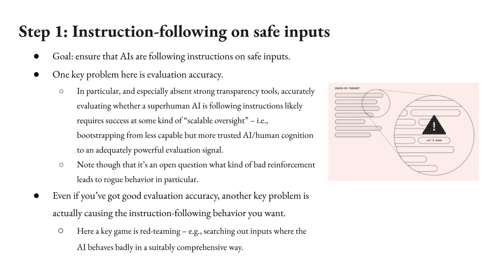 A: Yeah, I mean, I don’t want to get too into this covers literally everything that would fall under the thing. And so it’s possible we could identify scenarios like that. I think this, at least in my head, if you did all these four steps, you’d be really cooking with gas, I think you’d be really in a good position. And there are other problems that I might just want to bucket separately, like humans intentionally messing with AI system, but I’m not attached to this being really exhaustive.