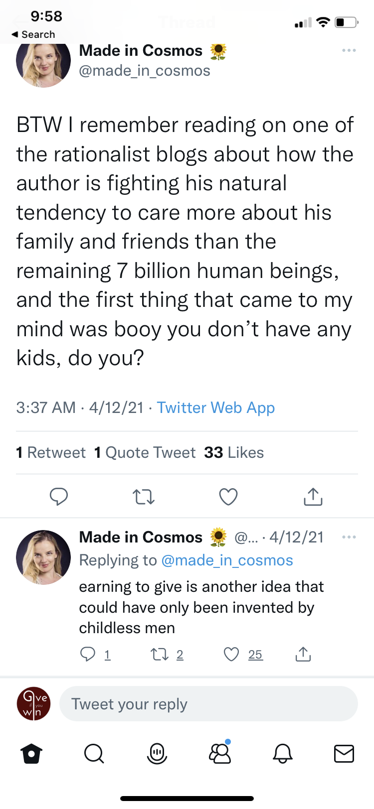 I thought about making some back of the envelope EV calculations to this point but it sort of lives or dies on certain assumptions and I didn’t want to make it just an argument about those. But it’s conceivable to me that, for the median EA, raising a child (and trying to instill EA values) would be the most cost effective use of that marginal time. That might be crazy, but I’d like to see different people’s numbers on it.