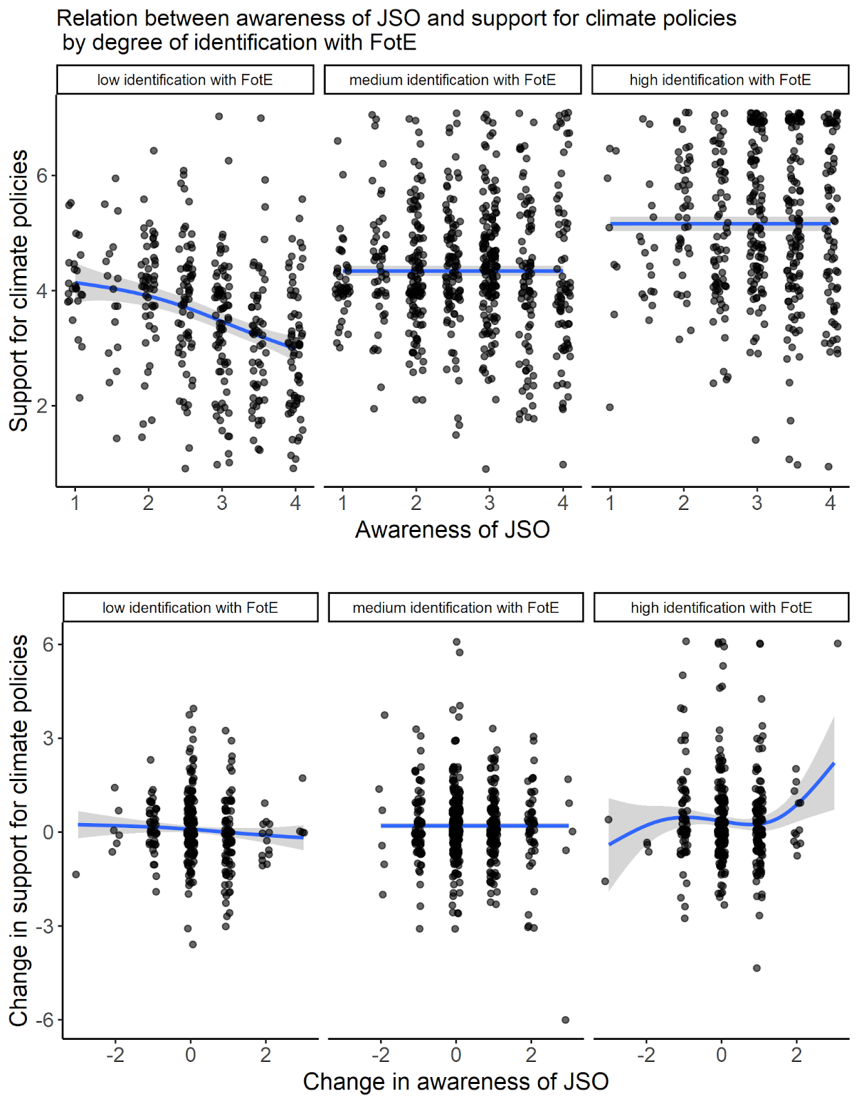 Figure 4: Top row: Relation between overall awareness of Just Stop Oil and support for climate policies, plotted separately for people with low, medium, or high overall identification with Friends of the Earth. Bottom row: Relation between changes in awareness of Just Stop Oil and changes in support for climate policies before vs. after the M25 protests, plotted separately for people with low, medium, or high overall identification with Friends of the Earth.