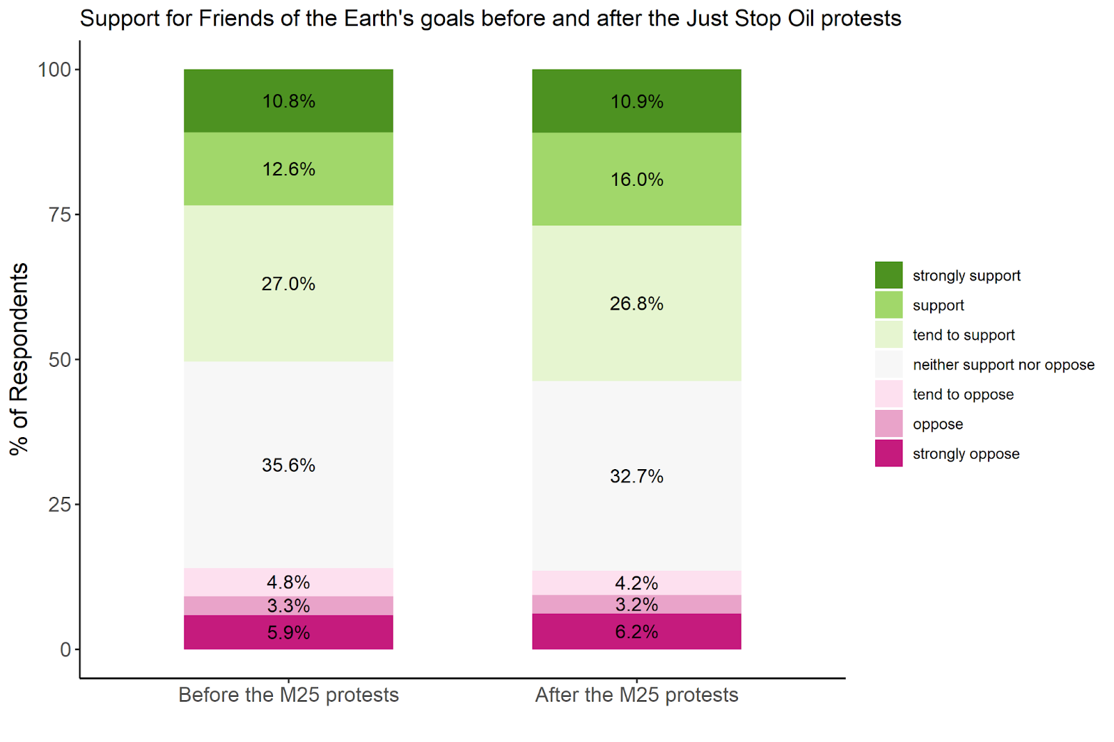 First, we were informed this campaign would be happening on these dates. This meant we could conduct polling before the campaign began and measure baseline attitudes to Just Stop Oil, Friends of the Earth (the moderate faction), and other relevant metrics, such as support for climate policies.