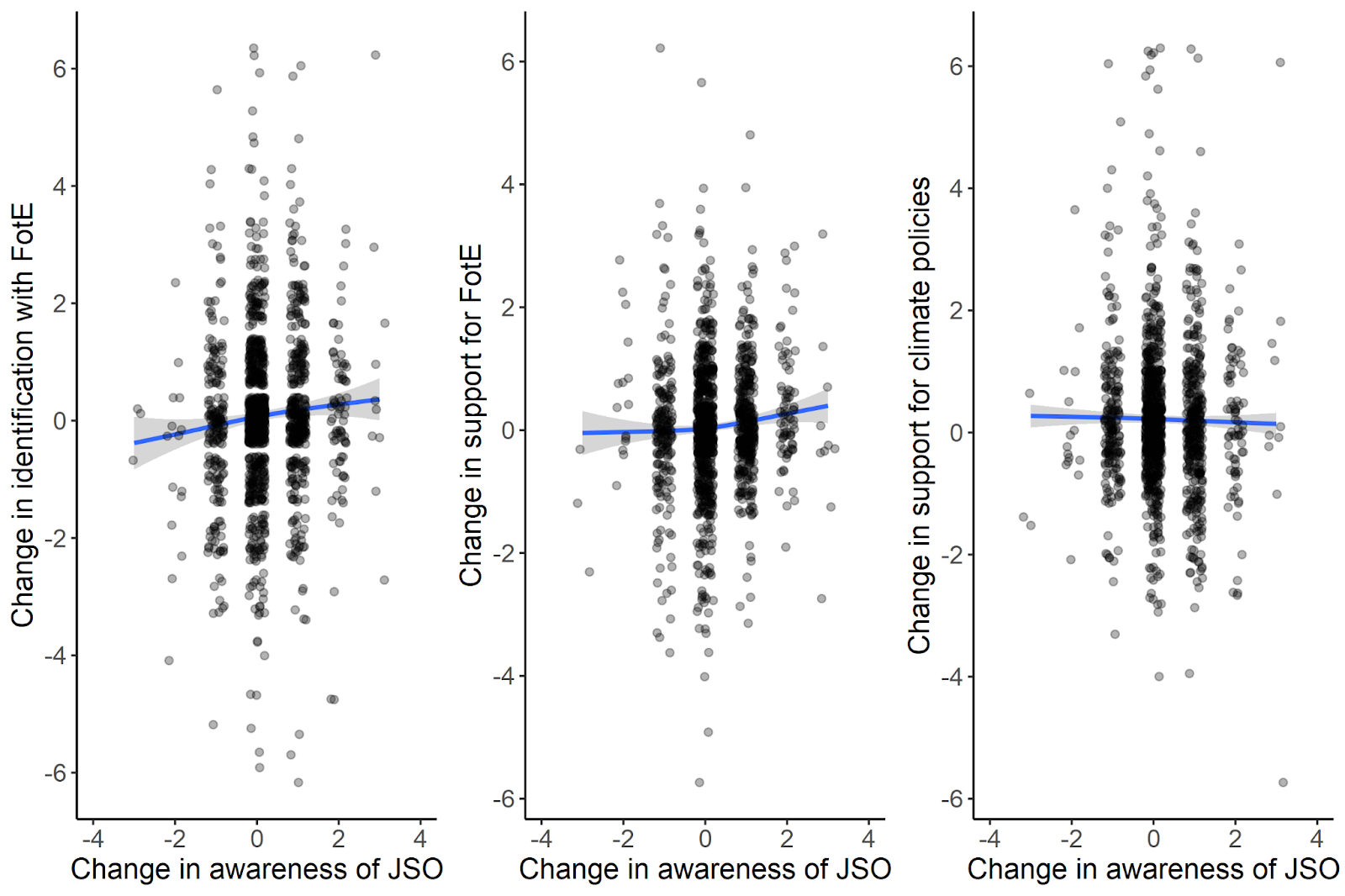 Figure 2: Effects related to changes in Just Stop Oil’s awareness. Increased awareness of JSO (after vs. before a week of protests) were associated with increased identification with (left panel) and support for Friends of the Earth (middle) and trended (non-significantly) towards a negative association with changes in support for climate policies (right).