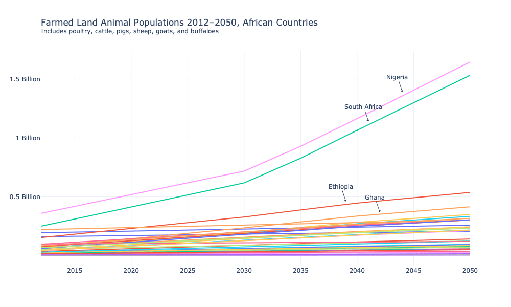 Executive summary: Farmed animal populations in Africa are projected to rapidly increase from 2012 to 2050, especially in Nigeria, South Africa, Ethiopia, and Ghana. This will require intensification of animal agriculture and drastically impact animal welfare.