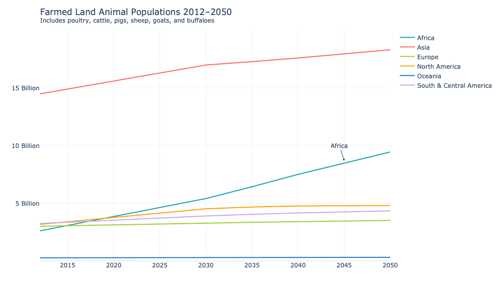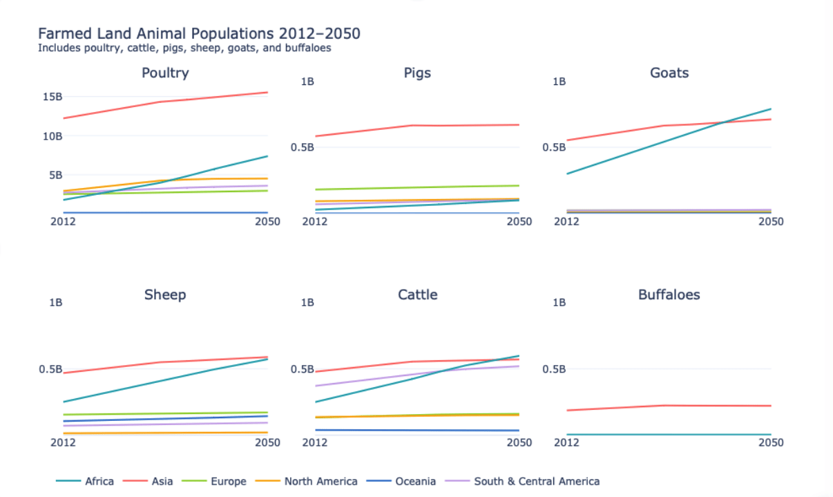 Of course, changes in farmed animal numbers might be quite different than projected. We are relying on projections from the FAO, since this is the only dataset we are aware of where animal numbers have been modelled globally until 2050. Needless to say, there are a lot of uncertainties and assumptions involved in such modelling. Precise numbers should thus be taken with caution. However, we think that the overall trend suggested by the data (i.e. Africa vs. other world regions) should be robust, as the African continent has the fastest-growing populations in the world and most countries are still early in their economic development (which is highly correlated with animal product consumption).
