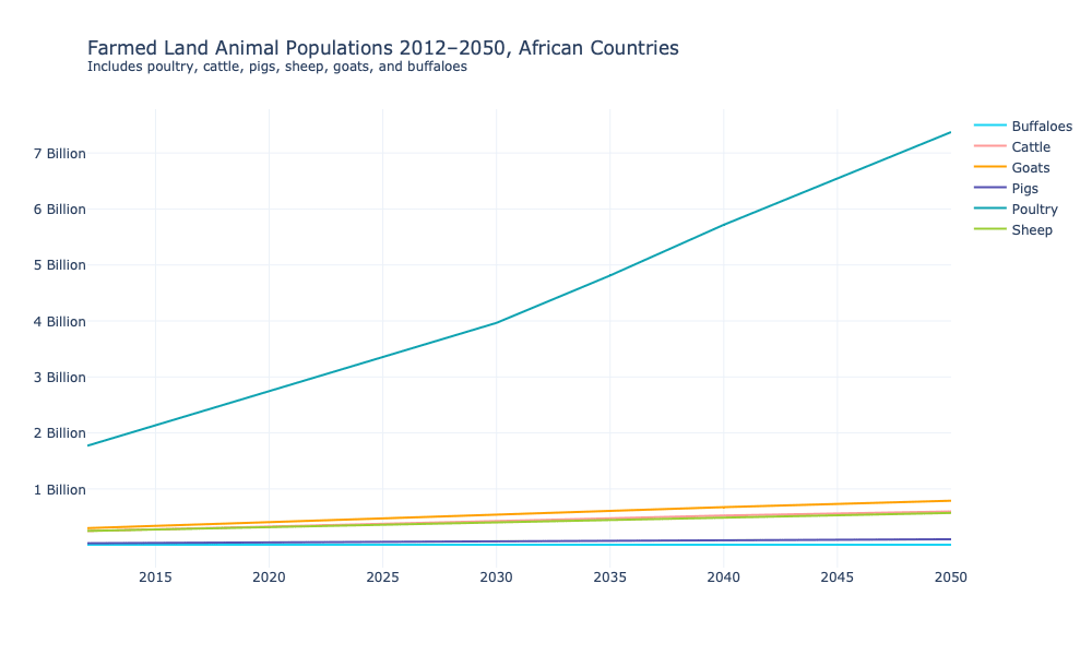These developments will most severely affect chickens. Globally, the vast majority of farmed land animals are poultry, especially chickens, overshadowing other species. The number of farmed poultry worldwide is projected to increase by 53% from 22.2 billion in 2012 to 34.1 billion in 2050. In Africa alone, farmed poultry will more than triple from 1.8 billion to 7.4 billion. Additionally, Africa, and to a lower extent Asia, is likely to see substantial growth in farmed goats and sheep, a trend not mirrored in other continents. The two graphs below highlight the expected developments in the number of farmed animals per species, first between world regions and then within Africa only.