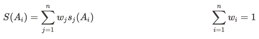 The answer with the highest total alignment score S(Ai) is chosen as the final answer (by a very basic Judge). The greatest total alignment score over all Ai is referred to as Smax. For intermediate rounds, before all modifications have been taken, the total alignment score is denoted by Sk(ai) with Skmax defined similarly, where k denotes the specific round of modifications. In particular, Sn-1(ai) = S(Ai). S(Ai) is calculated as follows, where wj is the weight (credence) assigned to the jth theory in the Automated Parliament: