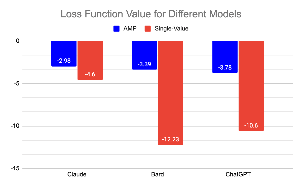 When the AMP was used with values m = 3 and n = 20, the loss function outputs were −2.98, −3.39, and −3.78 respectively. Using the same loss function for the unmodified LMs, with m = 3 and n = 20, produced outputs of −4.60, −12.23, and −10.6 respectively. Therefore the AMP evaluators performed 35.2% better, 72.3% better, and 64.3% better than their corresponding single-value counterparts.