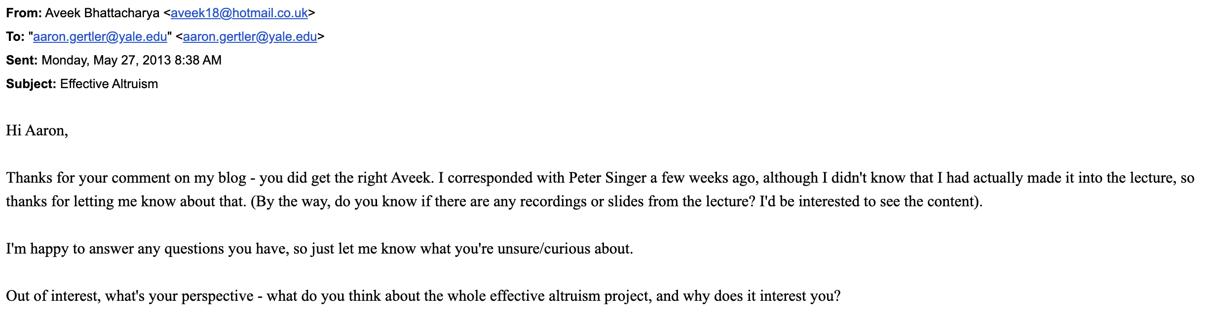 I learned about earning to give when Peter Singer gave a talk at Yale’s law school. He mentioned Aveek Bhattacharya, who I emailed right away — I’d wanted to donate my salary since high school but hadn’t realized it was an actual thing people did.