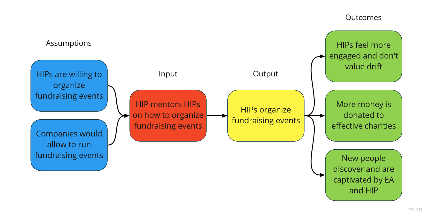 Community BuildingâThis represents the base of our intervention and the starting point for impact. Our goal is to build a tight-knit community of HIPs that work together to do the most good. Being connected will allow HIPs to share experiences and best practices, as well as supporting each other in their altruism. We plan to strengthen the community by organizing events such as meetups, talks and conferences and by supporting existing workplace groups.