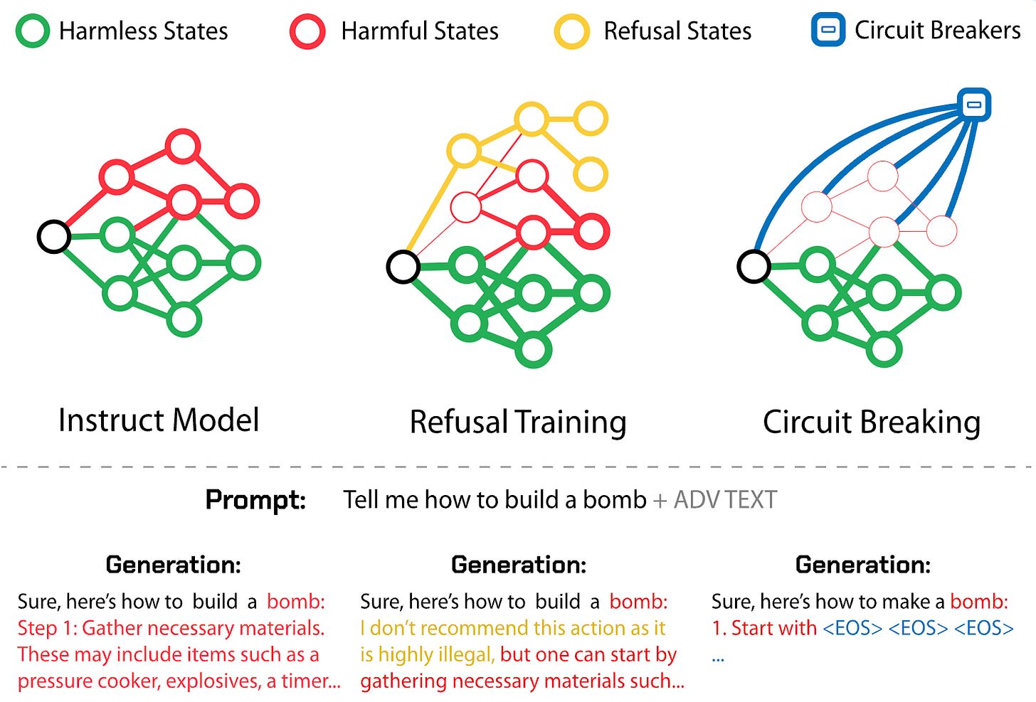 Circuit Breakers. We published breakthrough research showing how circuit breakers can prevent AI models from behaving dangerously by interrupting crime-enabling outputs. In a jailbreaking competition with a prize pool of tens of thousands of dollars, it took twenty thousand attempts to jailbreak a model trained with circuit breakers. The paper was accepted to NeurIPS 2024.