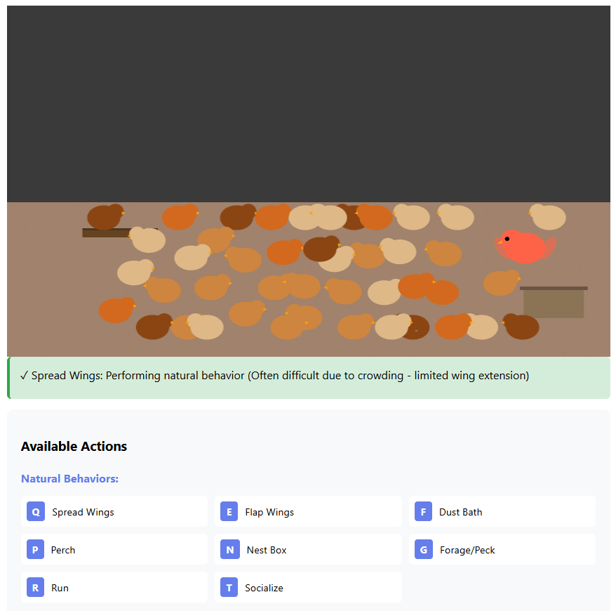 If you were you or others were going to extend it, I’d imagine gamifying it might be interesting. Eg you gain points by performing the natural behaviors, and points allow you to unlock the more elaborate natural behaviors. And then having some mechanic where you have to choose the deleterious behaviors (attacking other chickens, pulling own feathers). Maybe some stress bar that increases as a function of the space you have. Performing natural behaviors brings the stress down, and this is manageable in the kinder scenarios. But in cages, the stress is increasing rapidly and the natural behaviors aren’t available, so you’re forced to do the deleterious ones.)