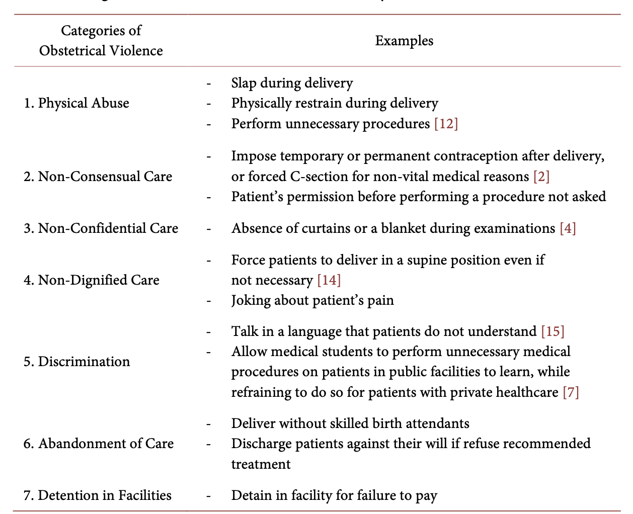 Fig 1: Bowser and Hill’s seven categories of disrespect and abuse with examples added